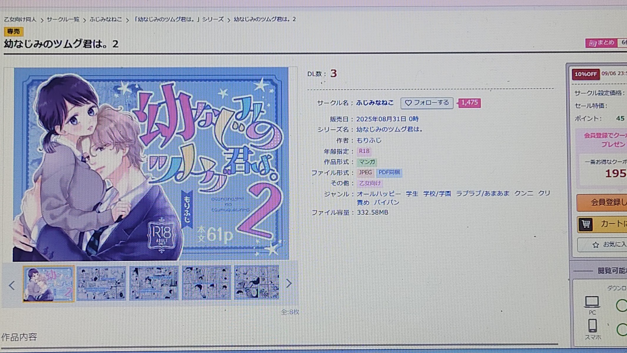「幼なじみのツムグ君は。2」はDLサイトで配信中で、初回登録クーポンを利用すると195円で読むことができます!